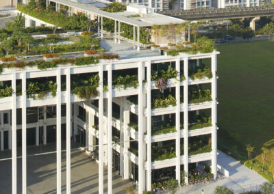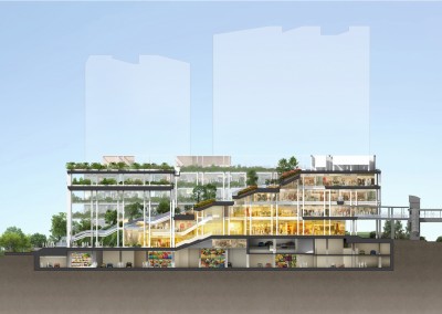The proposal is a demonstration in architectural form of one of the key visions for Punggol; the close integration of community and landscape. The design achieves this through the successive framing of community spaces with garden elements. For instance, the community plaza at the heart of the scheme is framed by a series of lush garden terraces sloping towards the waterway. This in turn is framed by a porous perimeter of platforms holding a variety of community functions and flora. The gardens will play more than just an aesthetic role in the community. They will be a horticultural project, bringing residents together to plant, maintain and enjoy them, nourishing community bonds. Ramps connect these gardens and terraces providing green and generous circulation routes up the building. Food courts, cafes and shops spill out onto the terraces where family activities also take place. Overlooking the communal gardens on the platforms are rooms and outdoor areas for communal dining, restaurants, education centres, and polyclinic rooms.