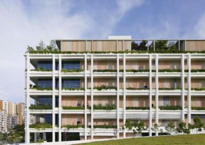The 27400 sqm project, dubbed ‘Oasis Terrace’ is an integrated development that brings together communal amenities and services in land scarce Singapore which includes communal gardens, play spaces, gyms, retail spaces, dining, learning spaces and 9400 sqm of healthcare facilities.