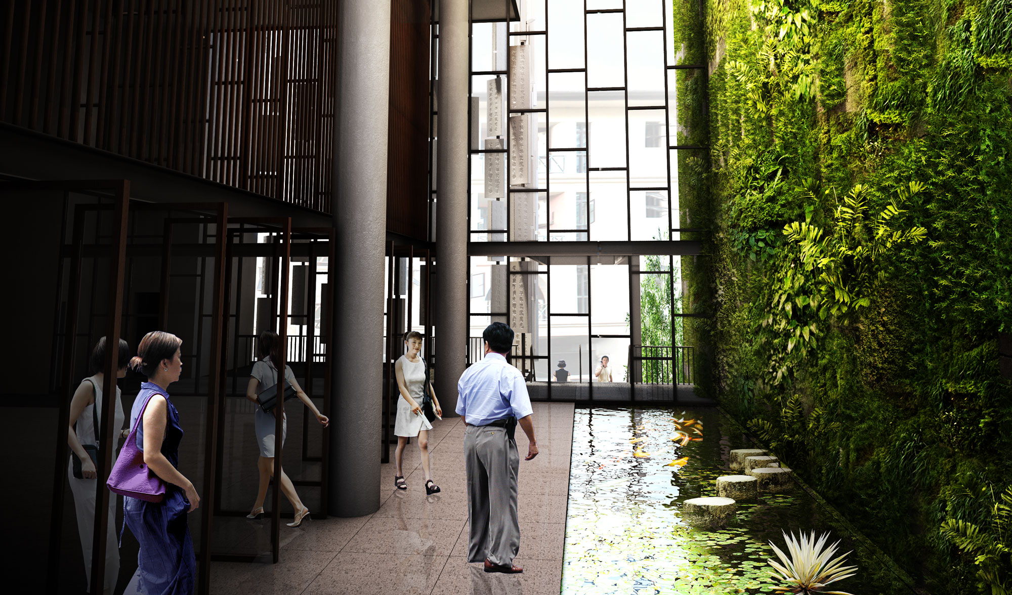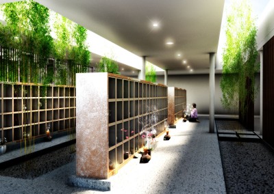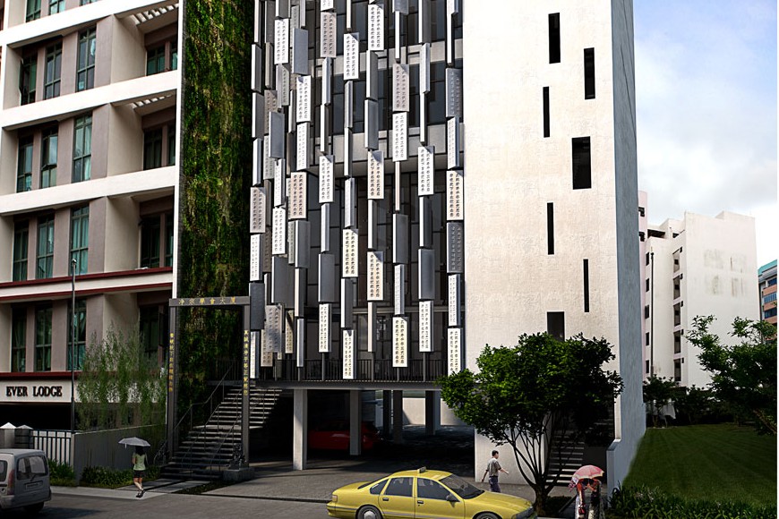 Located in the Geylang district of Singapore, the Amitabha Buddhist Society is a non-profit place of worship that does community outreach and provides charity services to local residents. Having outgrown their current location a few blocks away, the Society was looking to expand their operation in a new facility that would appeal to people of all religions and ethnicities in multi-cultural Singapore. The design is deliberately modern and non-traditional, to reach out to the community and welcome those of non-Chinese and non-Buddhist origins. Drawing on the Buddhist tradition of prayer wheels, the facade is partially kinetic, with large caved, mono-chromatic prayer tablets able to rotate in the wind and change continuously.
