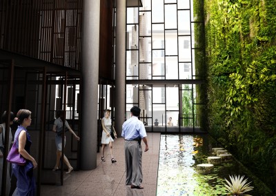 The Society identified green building technologies as an important part of their ehtical mission. As such, the building was designed to allow for passive systems to play an important role in reducing their overall energy usage and emissions. A large atrium is positioned between the adjacent terrace building and the new construction, to act as a solar chimney and draw hot air up and out through vents at the roof top. The first floor is raised above the gound level to allow for a naturally ventilated car park and air flow beneath the building, which doubles as a space for the letting off of thermal heat gain. All spaces adjacent to the atrium have high level vents feeding into the space for natural ventilation options. The main facade is designed as a double skin to provide sun shading for the interior spaces and act as a buffer between the exterior and interior environments.