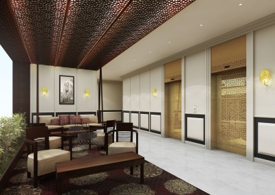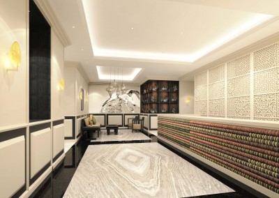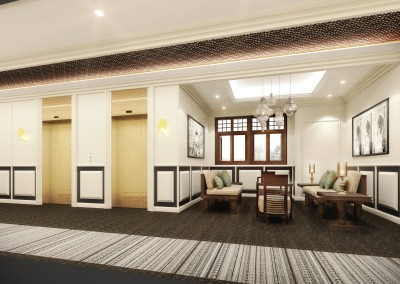 The hotel, in a conserved shophouse in the ethnic enclave of Little India in Singapore, is inspired by the design of Colonial India. The lobby and reception areas are designed around a monochromatic color scheme, with colorful accents that recall the vibrancy of the neighborhood. Wooden screens are used to create a more exotic atmosphere, which is continued in the dark timber floors and furnishings of the guest rooms. White paneling and moulding are used to compliment the shophouse architecture and provide contrast to the darker floors.