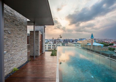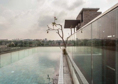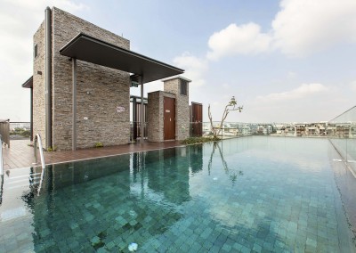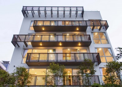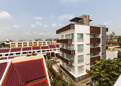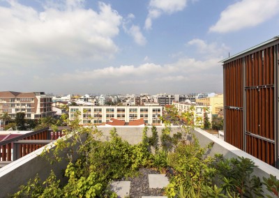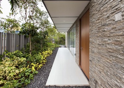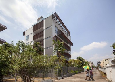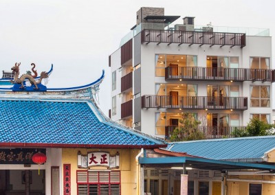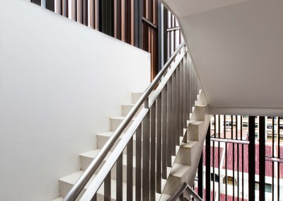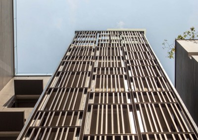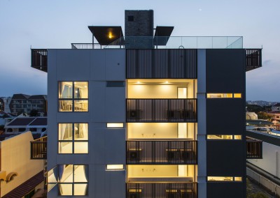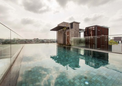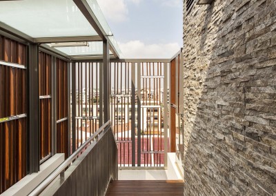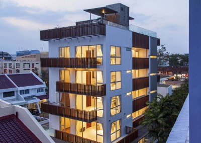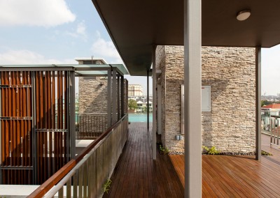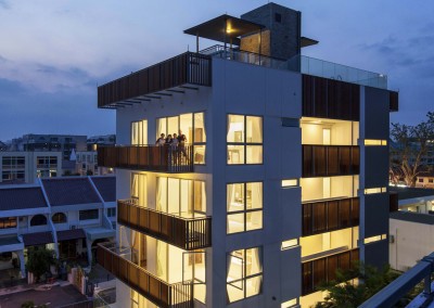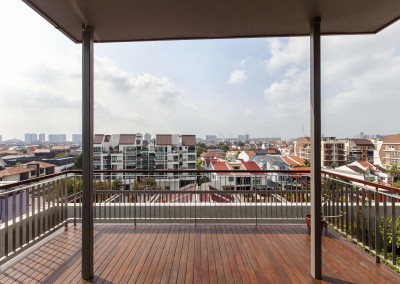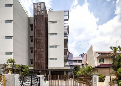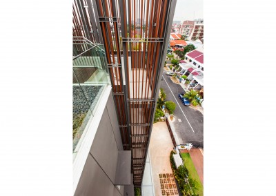 The façade began as an exploration of light and shadow building off the foliage of bamboo leaves, and was further developed into an open timber and steel screen, which allows for a range of shadows and light filtering. A dramatic 5 storey high timber screen, behind which is the naturally ventilated stair core, gives the front of the building its identity and character. At the roof top is a small pavilion and swimming pool that goes to the edge of the building, looking out over the rooftops of the surrounding Telok Kurau neighbourhood, including the minaret a modern mosque, and a traditional Chinese temple.