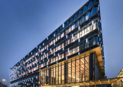 The façade features high performance glazing set into an alternating ‘accordion’ design that is animated at night with a re-programmable LED light system. The design combines vision and spandrel glazing to maximise views while mitigating solar gain.
