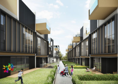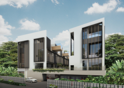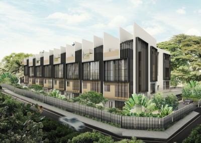 Consisting of 10 terrace and 2 bungalow units closely packed along a uphill slope, V Damansara, is an alternative interpretation to the cluster housing typology where the main design strategy is to fragment the large surface area along a typical row of terrace units. This is achieved through the insertion of ‘courtyard sleeves’ between units, alternating the private lap pools between the front and rear elevation and the deliberate emphasis of the parti walls between units, provide rhythm, ambiguity and curiosity on the functional spaces within.